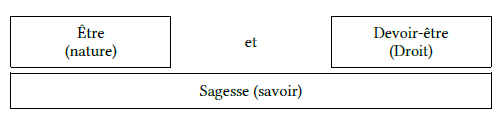 Une structure. — Les termes utilisés pour exprimer cette interprétation radicale du droit naturel classique peuvent être rassemblés en trois séries. La première rassemble les termes qui renvoient aux choses, à l’essence, à l’état naturel, au cosmos… Il s’agit de la série qui signifie la « nature » dans l’expression « droit naturel ». La deuxième série comprend les termes qui réfèrent à la règle, à la conformité, au devoir, à la prescription, à la justice, à la loi... Cette série signifie alors le « droit » dans le « droit naturel ». La troisième série rassemble les termes qui lient ensemble les deux premières séries : la sagesse, la raison, la logique (logos), la recherche… Elle assure la conjonction du « droit » et de la « nature ». Nous avons donc une structure qui émerge et que l’on peut noter de la manière suivante :